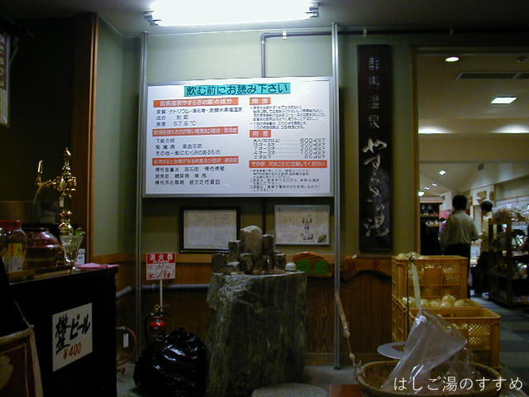 やすらぎの湯源泉 57.8℃ pH=7.7 成分総計=2810mg Na=819mg K=14.2 Mg=6.59 Ca=33.7 Cl=726 SO4=0.32 HCO3=1100