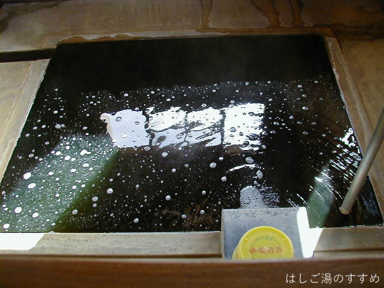 注ぎ込まれる湯はコーラのように赤黒いもので、湯温は浴槽内45℃と結構な熱湯です。浴槽サイズに対しての投入量は多く、鮮度抜群です。表面にはブクブクと泡が浮遊し、そっと浸かると体じゅうにビッシリ付着。湯揉みで掻き混ぜようものなら、それこそアワアワで湯が真っ白になります。この泡効果もあっては浴感はスベスベ。