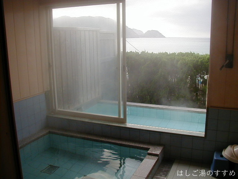 海沿いにある共同浴場です。内湯、露天風呂あり。湯に浸ると景色は覗めまません。木製浴槽には10L/minほどの源泉が投入されていて、その上に循環している模様。朝一番で訪問したのでお湯も新鮮、トロミを感じ塩味、苦味。しかしタブレット状の塩素殺菌剤が浴槽底にあったのには驚きでした。